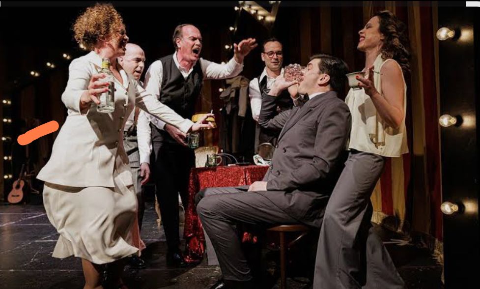 Scenografija (Ljubica Petrović) na početku odiše jarkim i veselim bojama ambijenta koji je svojevrstan spoj garderobe i pozorišnog bifea podražavajući ona predratna vremena („dok se puške ne očiste“) kao sinonim zabave, spontanosti, smeha. Posle uspešno izvedene Nušićeve „Gospođe ministarke“, glumci se opuštaju, druže, nezlobivo provociraju jedni druge. Slučajni prolaznik bi mogao reći – pregršt teških reči koje kao kolo šale idu u krug i u kojima gotovo niko ne vidi uvredu, već idealan povod da se nasmeje i na svoj račun.