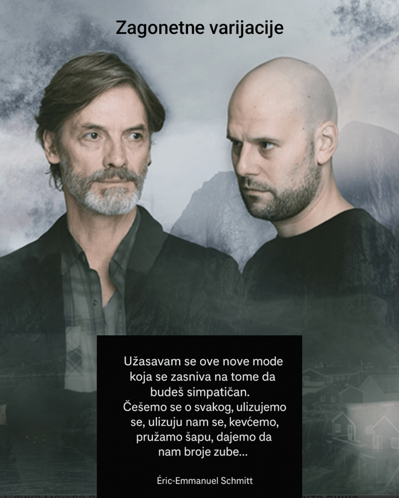 Pouzdan i vešto izgrađen temelj nam daje neku vrstu garancije da, ako uložimo valjan trud, možemo kreirati pravo pravcato čudo. U pozorištu bi sinonim za tu važnu inicijalnu tačku bio vrhunski dramski tekst i on bi sam po sebi trebalo uvek da bude više nego dovoljan stimulans da se uz glumu, režiju, muziku, scenski pokret i sve ostale neizmerno važne segmente napravi maestralna predstava. Erik Emanuel Šmit je kroz svoje „Zagonetne varijacije“ pružio štivo (prevod Stanica Lazarević) koje se na sceni Kult u Teatru Vuk, a u režiji Janka Cekića, pretvorilo u duodramu koju svaki istinski ljubitelj pozorišta ne bi smeo da propusti.